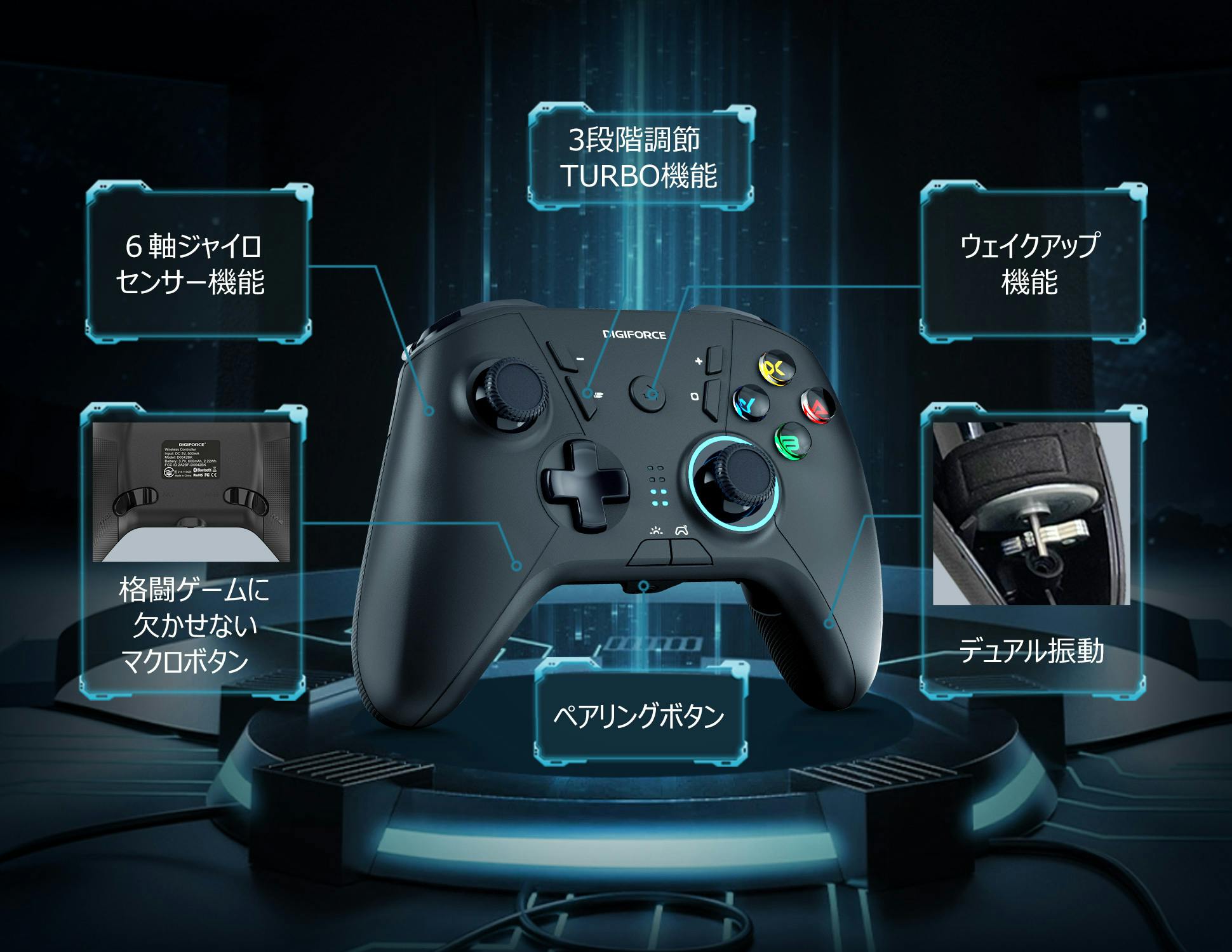 6軸ジャイロセンサー機能、加速度センサー、デュアル振動はもちろんのこと、A/B/X/Yボタン、右ジョイスティック周りのライトリングなど、多彩なLEDバックライトを搭載。また、マクロ機能や、設定したボタン押すだけで高速連射が出来るTURBO(連射)機能、Switch本体がスリープ状態の時にコントローラーのホームボタンを押すと本体の起動が可能なウェイクアップ機能など、ゲームをよりスムーズに楽しめることを重視した設計となっている。