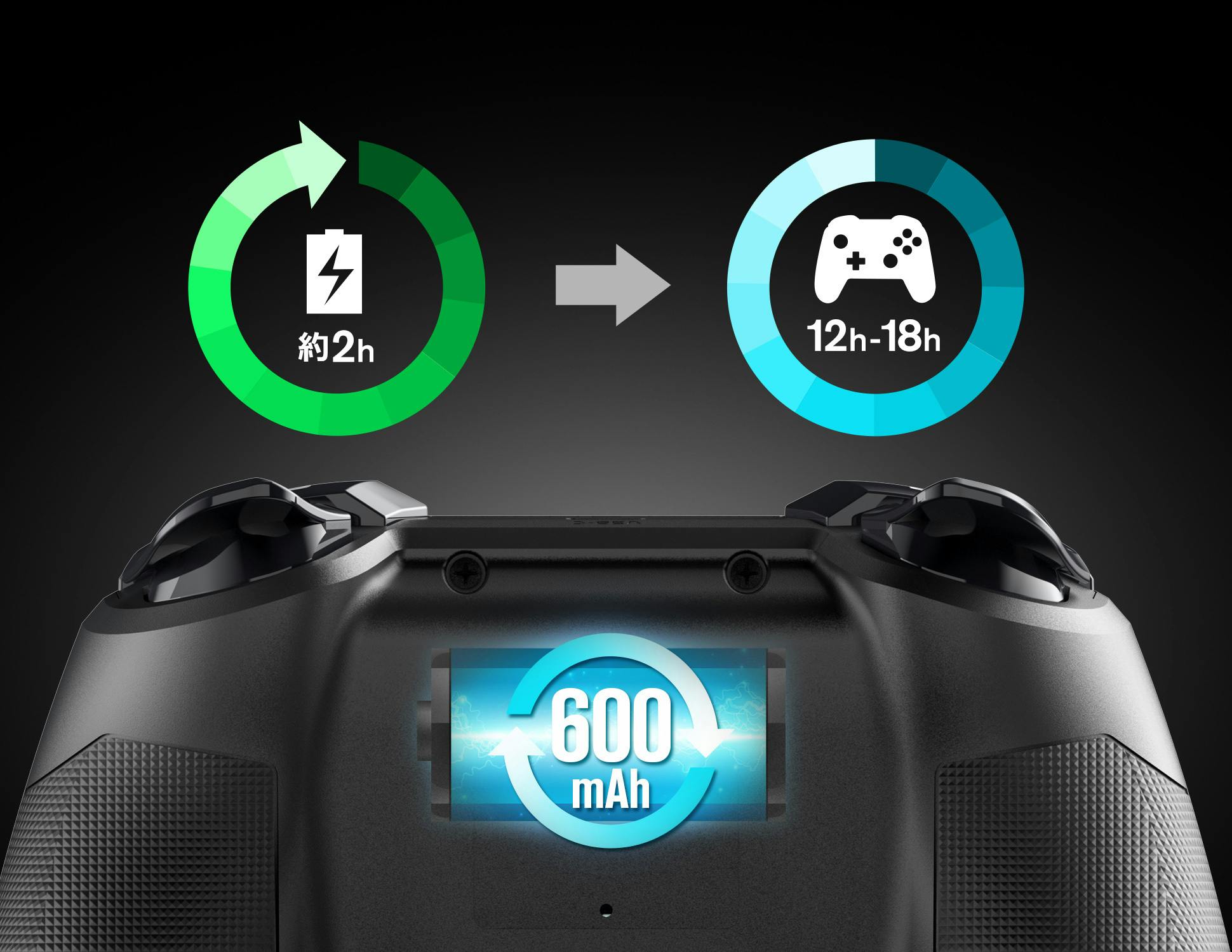 フル充電の状態から約12~18時間連続して使用可能です。また、電池残量が減ってきた場合は、Switch本体などの画面上に「電池残量不足」が表示されるため、プレイ中に突然 バッテリーが切れる心配もありません。