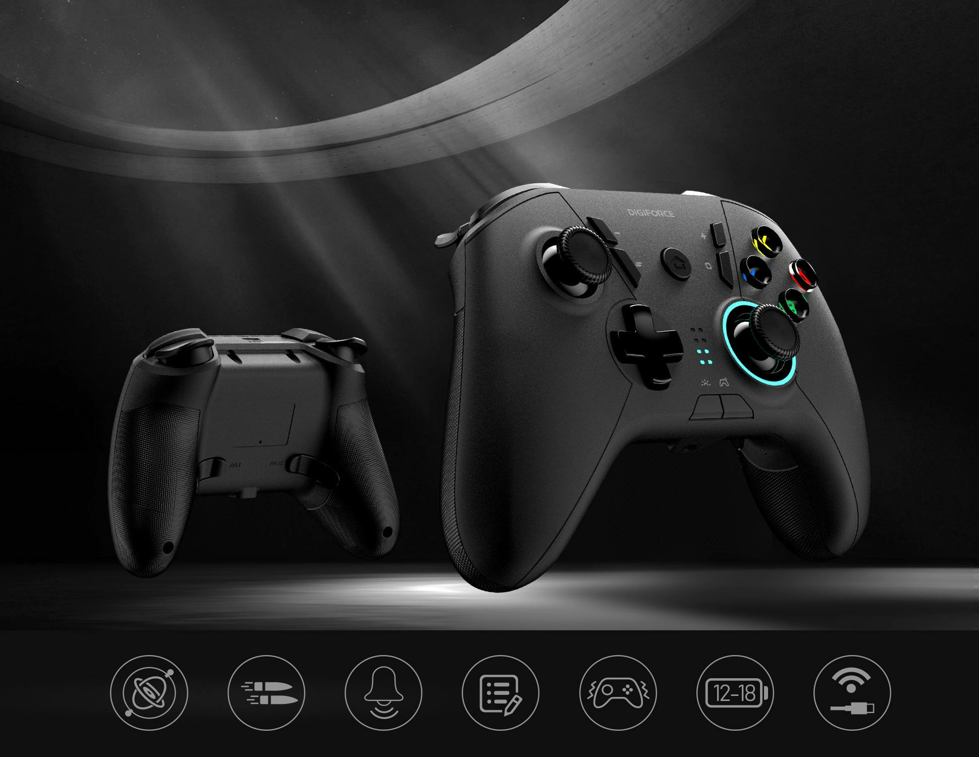 ゲームの臨場感を味わえる6軸ジャイロセンサー機能、加速度センサー、デュアル振動は当然のこと、A/B/X/Yボタン、右ジョイスティック周りのライトリングなど、多彩なLEDバックライトを搭載。